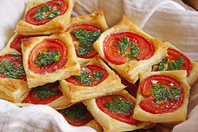 Rund 120 g Teig pro Pizzabrot entnehmen, etwas breit ziehen, 10 Minuten ruhen lassen. Auf einer bemehlten Unterlage ausrollen. Weitere 10 Minuten zum Entspannen geben und nochmals ausrollen.