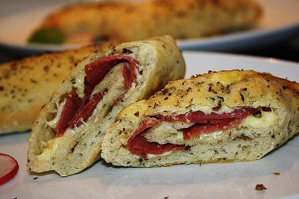 Pizzabrot bei 220° C für 10 min im Ofen backen. Gut darauf achten, dass der Teigling nicht zu dunkel wird.