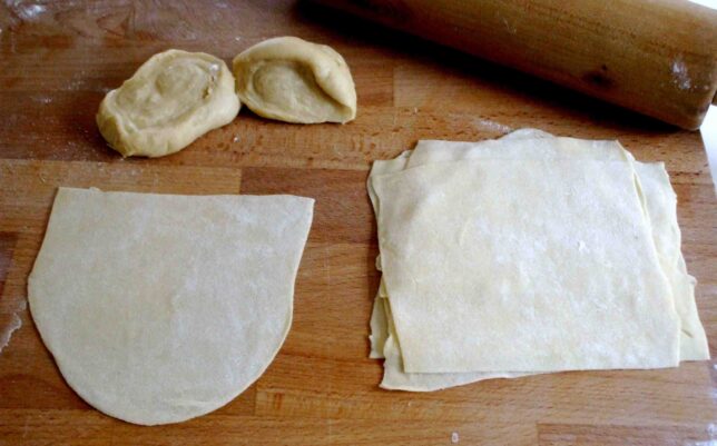 Mehl mit Eiern, Salz und Wasser zu einem glatten Nudelteig verkneten, 1/2 ruhen lassen. Portionsweise auf leicht bemehlter Arbeitsfläche hauchdünn ausrollen, mit Glas Taler ausstechen (d = 8 cm), nochmals platt drücken.
